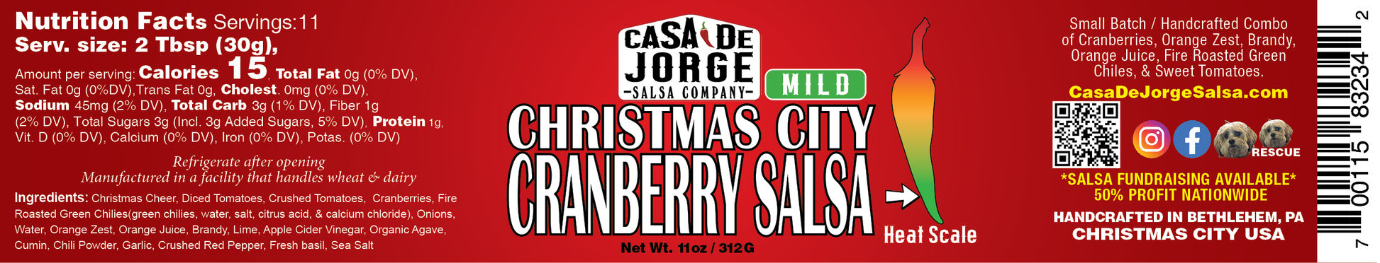 It's back for the Holiday Season. Christmas City Cranberry Salsa combines tart cranberries, orange zest, Organic agave, and brandy, and a mild salsa base for a balanced, festive flavor perfect for seasonal gatherings. Its vibrant taste enhances both savory and sweet dishes, making it an ideal accompaniment to holiday meats, cheeses, and appetizers. This handcrafted salsa offers a refined blend of textures and flavors that elevate your holiday menu.